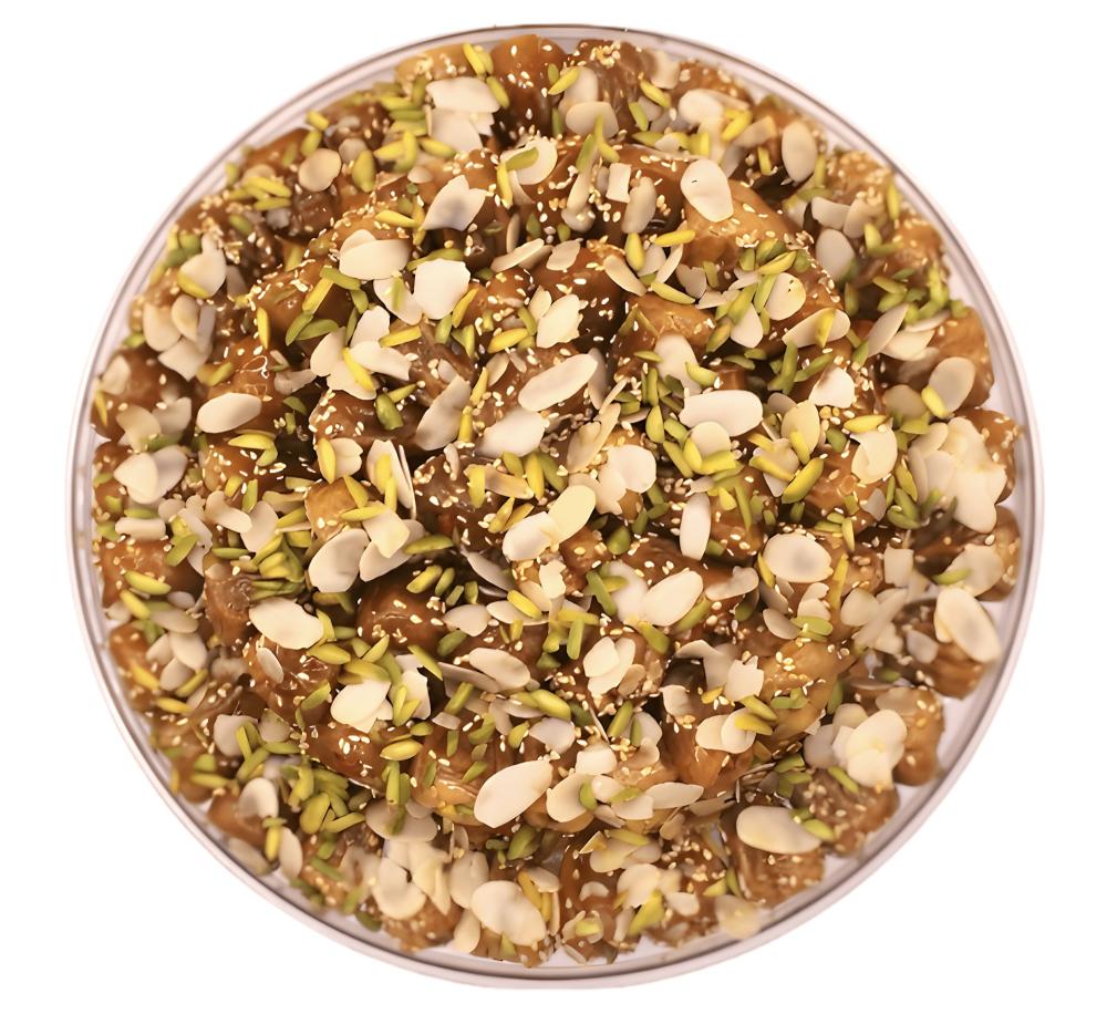 استمتع بمذاق التمر الفاخر مع صحن السكري المحشي باللوز، حيث تمتزج حلاوة تمر السكري الطري مع قرمشة اللوز المحمص، لتمنحك تجربة غنية ولذيذة. يعلوها رشّة سخية من قشر اللوز، الجوز، والمكسرات المختارة بعناية لإضافة نكهة فاخرة وقوام مميز.